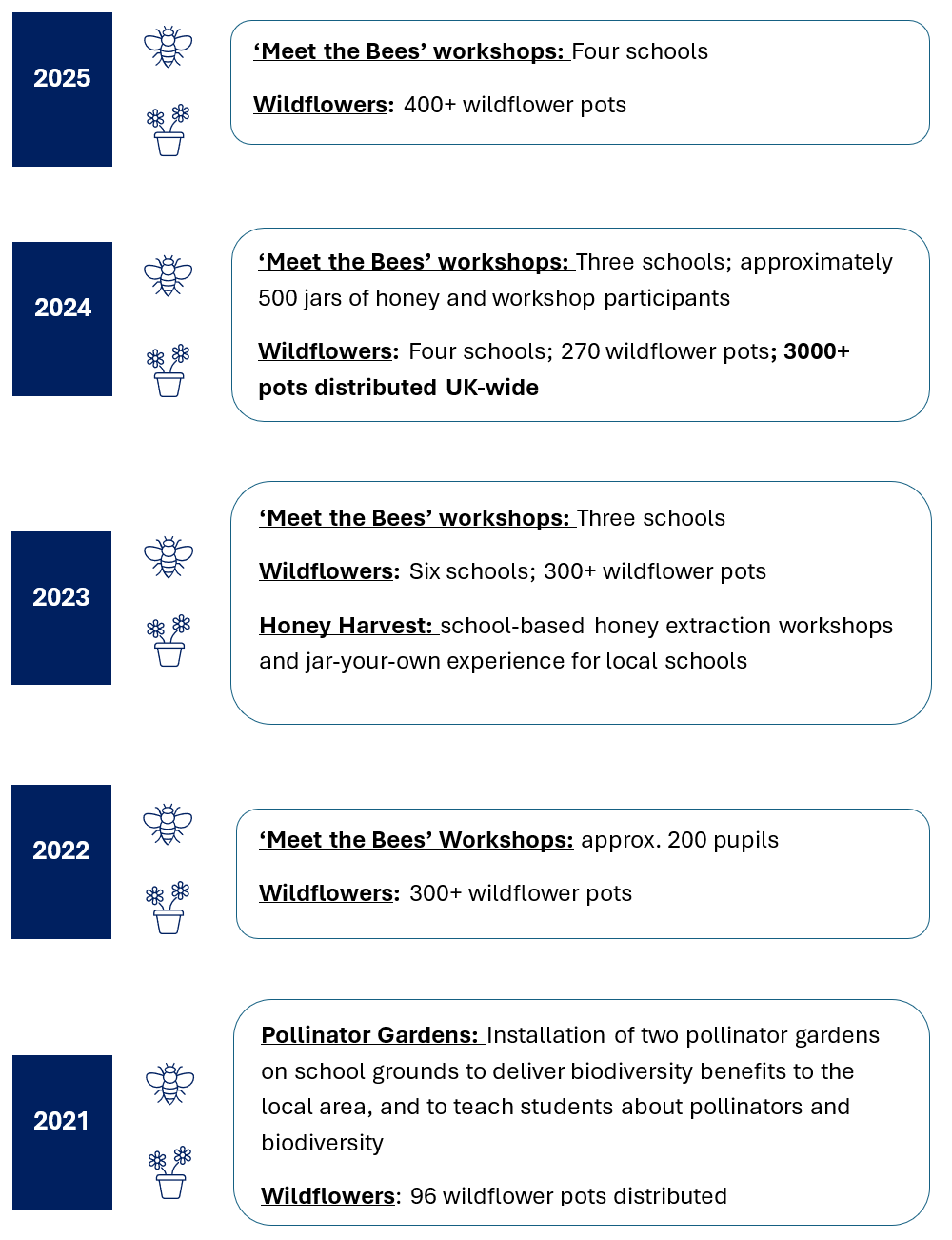 - Distributing wildflower growing kits and education resources across Britain: Students from primary schools learn about importance of bees, their role in protecting biodiversity and benefits of beehives